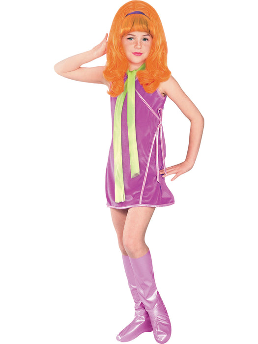 • Daphne is one of the crime solving, meddling kids from Scooby Doo! Daphne is known as the pretty and popular girl in the group, so who wouldn't want to dress up as her for Halloween or dress up themed birthday parties! Our Girls' Scooby-Doo Daphne Costume look lends itself to a great costume, with a fashionable 70's style and bright colors. The costume set comes with everything you need to get in character, including the costume dress, neck scarf, wig, and boot tops. The pink dress is sleeveless and is accented with a pink ribbon tied into a bow at the side. The light green scarf and pink boot tops help complete the look. Lastly, the costume kit comes with Daphne's stylish, piled up, and bright orange wig. Solve the mystery and look good doing it with our Girls' Scooby-Doo Daphne Costume!