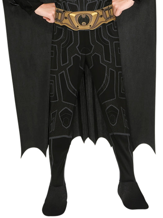 • Random car crashes, buildings blowing up, spontaneous magic shows...it sounds like your archenemies are at it again. You had better put on a Dark Knight Batman Child Costume and go stop him! This full body jumpsuit is sewn from a jet black material that will keep you warm without overheating and has attached boot covers. An intricate slate gray pattern outlines the Bat's armor plates, making it look like you could withstand any hospital explosion. The long black cape has a scalloped edge and falls to the calves. Pop on the half mask so that no one can guess that you're really Bruce Wayne! Each package includes your golden yellow belt--tie it around your waist and prepare for all of Harley's harebrained schemes! Gotham's citizens are real tough and all, but everyone needs a hero. Wear a Dark Knight Batman Child Costume with batarangs and black liner, sold here.