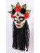 • Complete your Dios de los Muertos costume in time for the festivities to start by picking up the Day of the Dead Black Lace Senora Mask. This elegant and beautiful product unites the lovely with the macabre for a combination that is so vibrant its appeal has transcended cultures. This white mask features sugar skull style decorations, and the black lace detail acts as a faux hair that when combined with the flower ribbons and leaf laurel will provide a welcome dose of color.