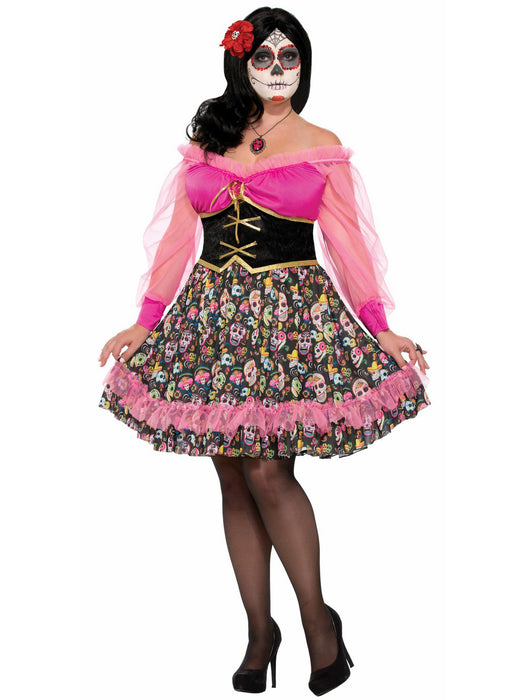 • Celebrate this special celebration of the afterlife by wearing the festive Day of the Dead Senorita Womens Plus Costume. In true Dios de los Muertos fashion this product unites the macabre with the beautiful making for an unforgettable look that will be right at home at any Halloween fiesta. This product comes with a lovely pink dress with a black corset flourish and a skirt decorated with bright colorful skulls that will serve to brighten up everyones evening.