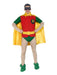 As a caped crusader, there is nothing you can?t do while wearing Deluxe Regency Robin Adult Costume. Known as the boy wonder, is the sidekick of Gotham's most famous crime fighter, Batman. This costume made of polyester construction includes green slippers, eye mask, Vest, cape, shirt, pants, and belt. The orange and green shirt features light skin-tone sleeves and a dark red velvet vest with a yellow ''R' letter' patch, and zipper in front. The included flesh-tone pants have attached green briefs with an interior elastic waistband for total comfort along. It also has green boot tops attached to the bottom of the pants and a molded yellow latex belt to join the pants and shirt together. As the final touches, we provide a black eye mask, to keep your identity hidden and a yellow cape with a collar fits around the neck with a button fastener. This costume is perfect whether you're going to a Halloween party, a costume or themed party, or a superhero cosplay event.