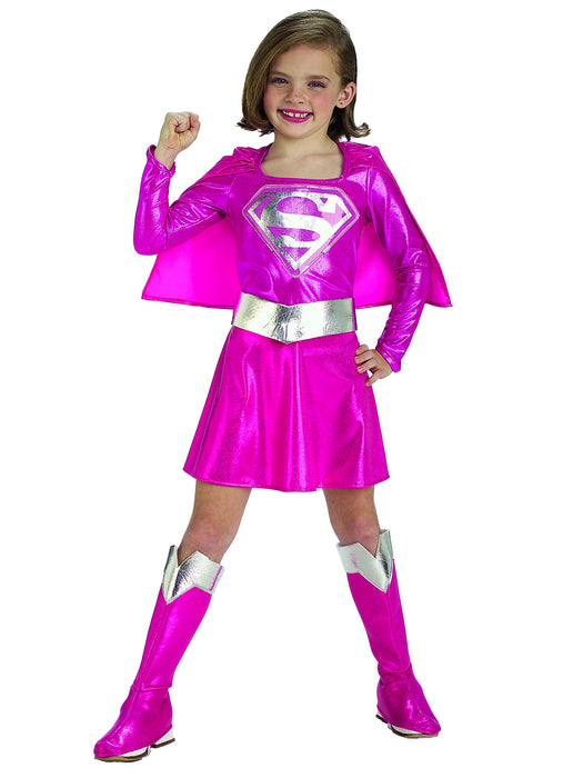 • Start her off on the path to being a superhero this year! When she wears our Pink Supergirl Toddler you can be sure that she'll be the best young lady in training! This adorable Super Girl inspired outfit comes with everything she'll need to emulate a tough superhero! A beautiful pink dress with an S applique front and center that has a complementing cape in the same shade of pink. With a silver belt on the mid section, it pops out and contrasts the vivid pink on the top of the outfit. The lower portion of the outfit has a skirt design to it with matching boot covers so you can be sure that any pair of shoes will match this Super outfit! Have your little girl transform into a new hero when she wears this Pink Supergirl Toddler!