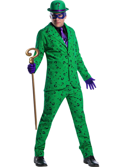 • The Riddler is one of Batman?s main enemies in Gotham City, and he?s certainly a real nuisance. Known for committing high profile crimes throughout the city, and then leaving all kinds of clues and hints to law enforcement, it?s no wonder he is on Batman?s hit list. This Halloween, become the infamous Riddler yourself when you buy the Riddler Costume for Men! With your purchase, you?ll receive everything you need to turn yourself into one of the most iconic Batman villains around. Team up with some of the other Gotham villains this Halloween, like the Joker, Penguin, Bane, Harley Quinn, and Two Face, and you can really send a message. Just imagine walking into the Halloween party as this motley crew of colorful Batman enemies. You?ll have everybody running! Pick up your Riddler Costume today, and this Halloween, be sure to cause all kinds of fun and witty mischief.