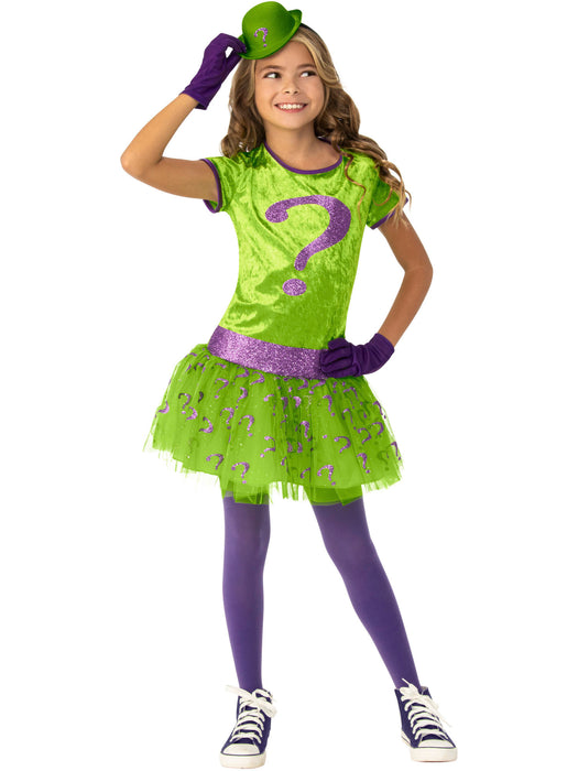 • Even though The Riddler hasn't yet been part of a major Batman reboot, your little girl can go old school with our DC Super Villains: Riddler Girl Costume! When she checks out this green costume with its question mark motif, she's going to feel ready to take on Gotham as one of Arkham's most eccentric baddies. Batman won't stand a chance when she's out there mystifying everyone in this cute and comfy girl's Riddler costume!