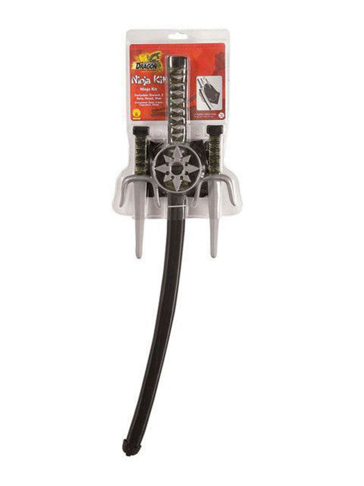 • This Dragon Ninja Accessory Pack has everything you need to construct your own ninja costume. The kit includes a black 30 inch samurai sword, matching twin sai, and a silver throwing star. A black hood is also included to conceal your mysterious identity.