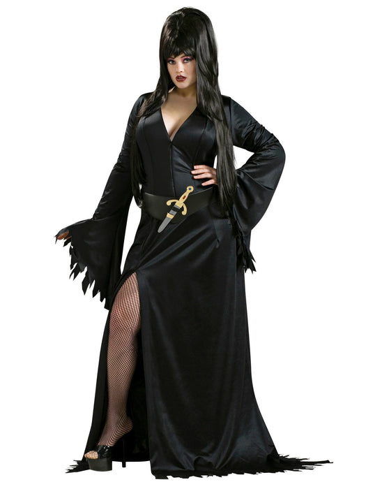 • Become the true Mistress of the Dark this year when you put on our Women's Plus Size Elvira Mistress of the Dark Costume. Walk into the party sporting this gorgeous and elegant look, and you bet there will be bats flying as you make your grand entrance. With this set, you will receive a stunning black dress with jagged decorative edges, a matching black belt, and a ceremonial dagger (wig not included). Wearing this dark sorceress look, you'll feel more powerful than ever.