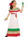 • Our Fiesta Dress for Kids is a beautiful, festive costume designed to help kids express their identity and cultural pride. Crafted using a lightweight, comfortable polyester material, this white off-the-shoulder dress features bright, colorful detailing around the top and bottom in the form of red, green, yellow, and blue striped accents. A red sash is included. Perfect for Cinco de Mayo celebrations, costume parties, or playtime!