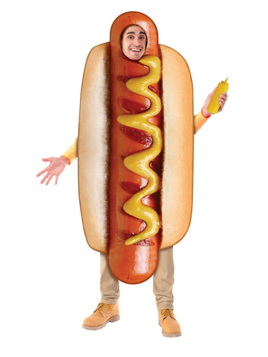 • If you have always wished to be a wiener then your dreams will come true! Put on this Frank Hot Dog Costume and turn into everyone?s favorite baseball game snack. We will be frank about it and you can too, this outfit is a fun and simple item to wear. You receive a cutout which goes over your entire body. It depicts a realistic image of a hot dog in bun. There are grill marks and yellow mustard printed along the surface. A hole is cut out at the top so you can fit your face through. Have this Frank Hot Dog costume ready for Halloween parties and hot dog eating competitions. Even though they are a mystery meat, hot dogs are definitely tasty and could be eaten while wearing this around. Pair up with a few friends dressed as a bottle of ketchup or other condiments for group outings.