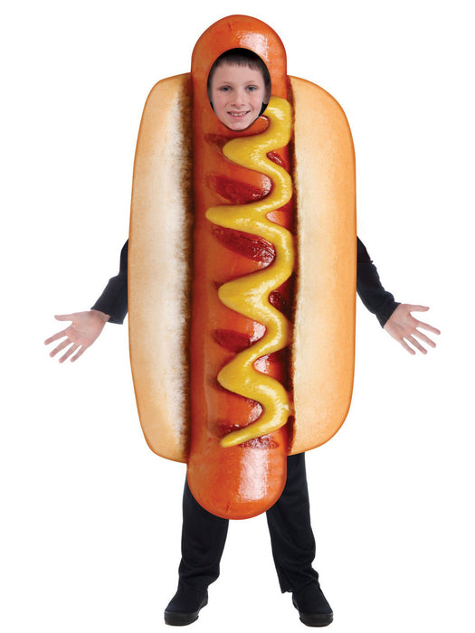 • If all pork chops were perfect, we wouldn?t have hot dogs. And without hot dogs around there would be no Frank Jr. Hot Dog Costume. Kids enjoy a good frankfurter once in awhile and they are going to love looking the part as well. You receive a simple item to slip over your body. It is printed to appear as a realistic hot dog set in bun. Grilled marks and a stream of mustard are also depicted. A circle is cut out along the top which allows for your face to peek through. The Frank Jr. Hot Dog costume is a comedic choice for Halloween and other dress up occasions. This can be worn around for all kinds of quirky moments at the grocery store, barbeques, cooking by the campfire and more. Grab a bottle of ketchup or some relish and carry it around for some added effect to make everyone hungry.