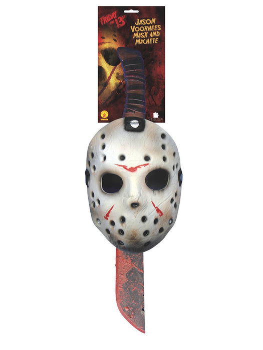 • When the counselors said there would be a surprise during the camp fire, nobody expected this! Wear a Jason Mask and Machete set to knock 'em dead. This package gives you a bright white hockey mask with red marks and a long, rust-colored machete. Great for fans and costumers alike.
