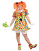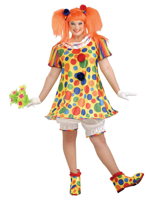 • Have some laughs this Halloween with the Giggles the Clown Adult Plus Costume. This entertaining outfit comes with a dress, shoe covers, hair scrunches and bloomers. Featured on the dress are three large pompoms. The dress itself is yellow accented with various sized polka dots in orange blue and green. It's a short skirt but you get some extra coverage from the white bloomers, which have a multicolor trim. The shoe covers are a matching polka dot pattern with red trim. Topping off the look are two colorful scrunchie hair bands, each accented with a pompom. The wig, however, is not included. Don this outfit for a Halloween bash or a kid's birthday party. Order clown makeup and other accessories from us to enhance your clown style.