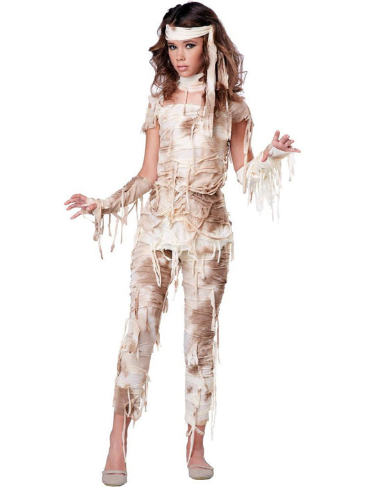 Tweens, this Halloween ask your mommy to buy you a Girl's Mysterious Mummy Costume. Offered in Large (fits 10-12) and extra-large (fits 12-14), the ensemble includes pants, a top, neckpiece, glovelettes and head tie. All are made of white fabric that looks brown and tattered from age. Mummies are essentially dead bodies that have not naturally decayed. The most common method of mummification is quick drying the body - using the sun, fire/smoke and chemicals- since bacteria and fungus cannot live without water. Many famous mummies were created purely by accidents, but Egyptian mummies were created purposefully. Ancient Egyptians believed the life force left the body at death, but it could be lured back and then the body and life force would enter the nether world. It is perhaps this belief that lead to stories of reanimate mummies that stalk the living. Who will you haunt this Halloween?