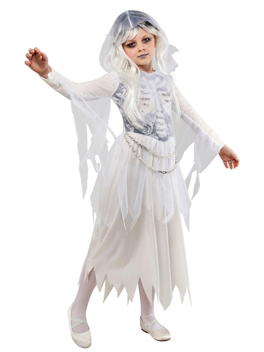 • Prepare for a hauntingly beautiful transformation with our Girls' Spooky Beauty Ghost Costume. This set will transport your child to the spirit realm, turning them into a captivating and ethereal apparition. The centerpiece of this costume is the beautiful white skeletal dress, adorned with tattered edges and trim for an authentically eerie touch. Complete with a matching attached white hood, this ensemble is perfect for haunting a room in style. Don't miss the chance to own this gorgeous ghastly look that will leave a lasting impression on all who encounter it. Embrace the supernatural and scare your friends in style!