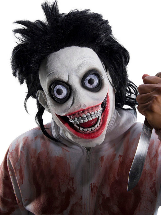 • Bring those Creepypasta stories to life with our Go To Sleep Latex Mask. Jeff the Killer is a popular character from some scary tall tales. This particular item depicts a very pale faced with huge eyes. The mouth has braces and scars along the lips. Long, black hair is attached to make it complete. Become Jeff and nobody will fall asleep after getting a look at you. The eyes will be the last thing they ever see.