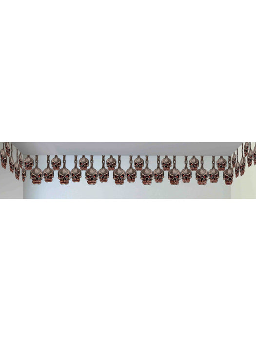• Complete a dungeon setting in your own haunted house plans by using this Hanging Skull Border Decoration. It adds just a bit more to the already terrifying experience. It comes as a wall border to place along the top near the ceiling. The printed images show evil skulls attached to chains. The decoration is great for giving any room a horrifying appearance. If youre in need of even more Halloween and scary props or decorations, we have plenty to choose from at great deals.