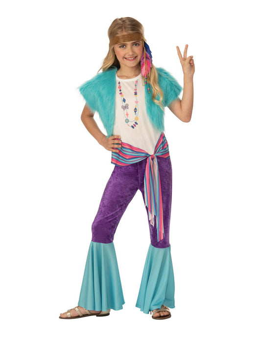• Your daughter will be the happiest hippie alive this Halloween when you pick up our Happy Hippie Girl Costume! With your purchase, you will receive a pretty white top, a beautiful mint green shrug, a pair of dazzling purple pants with mint green bottoms, and a fun and colorful feather headband headpiece. Pair this get-up with some cool peace sign earrings and jewelry, and you'll be all set to spread love and happy vibes all Halloween long!