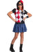 • Being a good girl all the time is not always fun. This Halloween, be a little mischievous and dress in the Harley Quinn DC Super Hero Girls Hoodie Dress. A dress, waistband, black eye mask and black and white wristband are all included. The short sleeve dress features an attached red and black hood, a bodice with black, white and red harlequin diamond patterns and a blue skirt. It?s the perfect outfit to wear when attending the Krazy Karnival and investigating Mirror Master. It?s also perfect for hanging out with best friends Wonder Woman and Poison Ivy. At Superhero High School, Harley is the prankster and class clown. This version of Harleen Quinzell is a true hero. Although sometimes things like becoming an internet star are more important to her, in the end being a hero wins out. For Harley, grades are not as important as getting some attention and some laughs from the other girls in the school. Her superpowers are advanced athleticism and acrobatics and she enters high school on