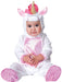 • Your little one will be so cute, people won't even believe she's real! The ever-elusive unicorn is one of the most beloved mythical creatures and our Infant Toddler Magical Unicorn Costume will have your baby looking like the most adorable version of the enchanted animal ever seen. The costume features shiny white jumpsuit that will cover the mini unicorn from her neck all the way down to her toes, the feet of the costume feature skid resistant material which will make galloping away all the more easier. The jumpsuit features a shiny pink belly and matching arm cuffs. The costume also comes complete with a white hood with shiny pink ears, hot pink hair, and a golden horn rising out of the horse-like plush head. The magical unicorn is not only a costume of beauty, it's a costume of convenience with snaps along the legs for easy diaper change.