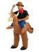 • This ain't your first rodeo. Round up the Inflatable Bull Rider Costume to wear down on the range. Riding on the back of a bull is no walk in the park. You have no room to clown around while up there as it will kick and buck trying to shake you. Get a good grip and hold on for dear life! This particular costume is made to be a humorous choice. You receive a lower body suit to wear. It is comprised of bull legs for you to wear over your own. A body surrounds your waist which has an angry bull character. Fake human legs are set above the bull so it looks like you are riding atop of it. Blow up this bad boy and the Inflatable Bull Rider costume is ready to rampage. Pick it out to wear around at Halloween parties, county fairs, and other dress up occasions.