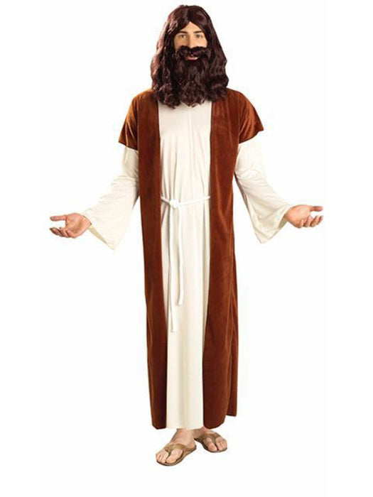 • Recreate the Nativity scene this Halloween when you wear the Joseph Adult costume! The outfit features an ankle length cream tunic with long, open sleeves. Also included is a white rope belt to tie around the shirt. On top of the tunic, wear the ankle length, short sleeve robe that is open in the front. The sandals, wig, and beard pictured above are not included with the ensemble. This costume comes in one size that fits most men and women, so everyone can enjoy this getup! This costume is perfect for Halloween, but it is also great as part of a holiday play or to wear to your Christmas party! Purchase a shepherd's crook, a pair of brown sandals, or a Biblical wig and beard set, each sold here separately, to complete your holy look.