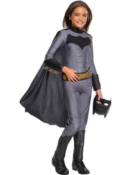 Begin building your team of heroes in order to protect the planet! Bruce Wayne is doing everything he can to ensure the future of the world, even donning the Batsuit and entering the fight. Now, you can join in as well by wearing the Justice League Girls Batman Jumpsuit. Batman has been a hero for decades which means all kinds of fans are going to enjoy the caped crusader. Ever since the 1930?s Batman has gone through some major changes. Those familiar with his most recent appearance in the Justice League film can dress just like him. He unites with other popular heroes to defeat alien invaders, make sure you are ready by picking up a brand new Batsuit. This outfit comes as a single piece jumpsuit. The iconic bat symbol and other details are printed along the surface. There are molded gauntlets and shin guards attached. You also receive a utility belt and long cape to make it complete. Top it all off with a plastic face mask to hide your true identity. You can search the streets of Go