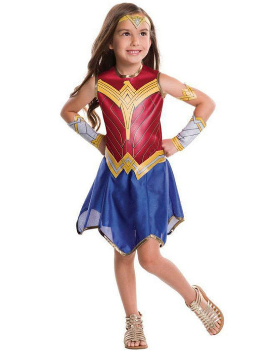 • Your little girl may be handy with a lasso, but can she take down enemies in style? Of course, she can! This Halloween, your bundle of joy will instantly transform into a heroine when she wears this amazing Justice League Girls' Wonder Woman Costume! Bold, red colors and brilliant blues accentuate this disguise in authentic Wonder Woman fashion! Includes dress, belt, gauntlets, tiara, and armband.