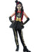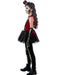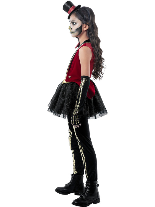 • Your little angel will be leading the entire undead circus this year when she is wearing our Kids Circus Skeleton Girl Costume. With this set, you will receive everything your tyke needs to entertain the crowd with giant skeletal elephants and zombie motorcyclists in cages. Featuring a beautiful red, gold, and black sparkling dress with an attached vest, a pair of black and gold skeletal leggings, a matching pair of arm sleeves, and a tiny top hat, you're going to love this spooky look on your daughter this year.