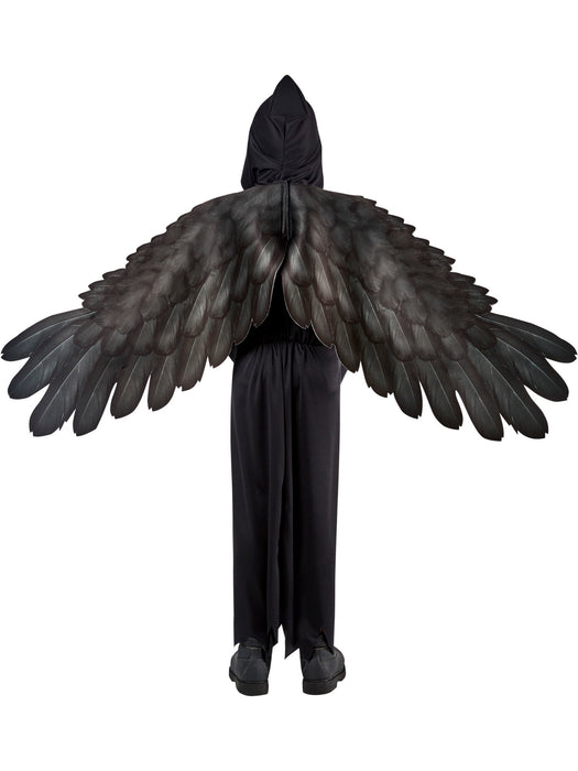 • It will be pretty clear that your child didn't fly down from heaven this year when you dress them up in our Kids Death Angel Costume. With this spooky set, you will receive everything your tyke needs to emerge from the underworld and wreak havoc wherever they go. Featuring a dark black robe with feathered black death angel wings, as well as a separate black hood, your kid is going to be looking and feeling powerful as ever sporting this haunting look.