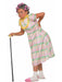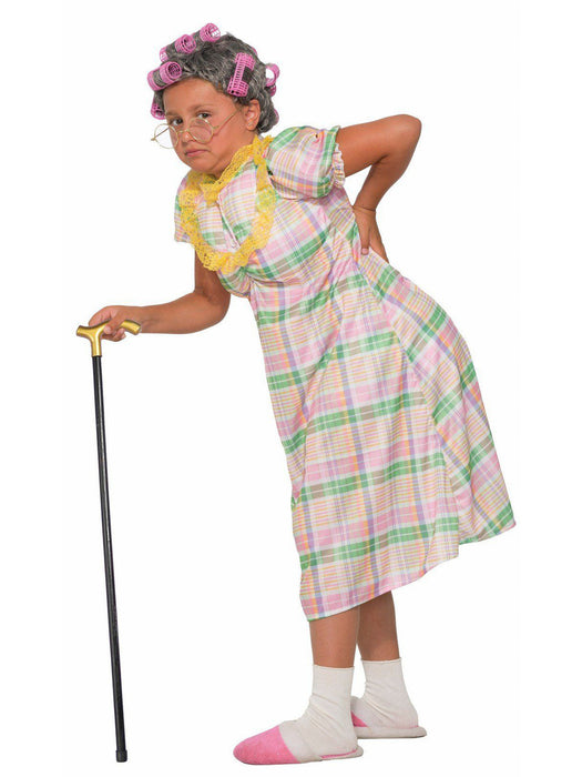Don?t throw out your back or break a hip trying to find the perfect Halloween costume. Put your teeth in, get your spectacles on and check out this Kid's Granny Gertie Costume. Your child may be growing up before you know it, but this outfit will have them decades older than you thought! Orders come as a single dress. This muumuu-style gown is quite colorful and perfect for playing bridge with the gals, relaxing with a nice cup of tea, or going out on the front porch to yell at neighbors. It is even a bit padded along the chest to give a sagging appearance. Take on the role of an elderly lady for all sorts of occasions. Wearing the Granny Gertie costume is perfect for Halloween parties, theatrical performances, or if you just want to check out a nursing home sixty years early. Look around our website to find additional props and accessories for a lovely senior citizen.