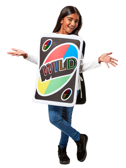 • Your kid will be pulling all the best cards this year when you dress them up in our Kids' Mattel Games Uno Wild Card Costume. With this set, you will receive everything your child needs to run the Uno table and take home the victory. Featuring a fun colorful Uno Wild Card styled tabard that your kid can wear right atop their everyday clothing, this costume is a real winner. Pick up yours today, and then go challenge all your friends to a game of Uno for a night you'll never forget!