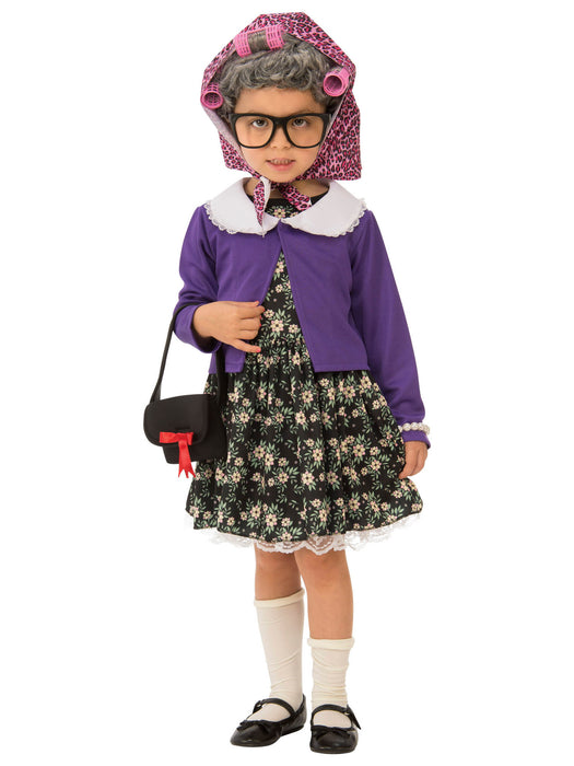 • Your daughter is sure to imitate her grandmother when she puts on this Little Old Lady Costume for Girls'! Even granny will have to laugh when she sees your little one in this dress, sweater, and headpiece which will make her look like she's already reached her golden years! Don't miss this adorable kid's Halloween costume!
