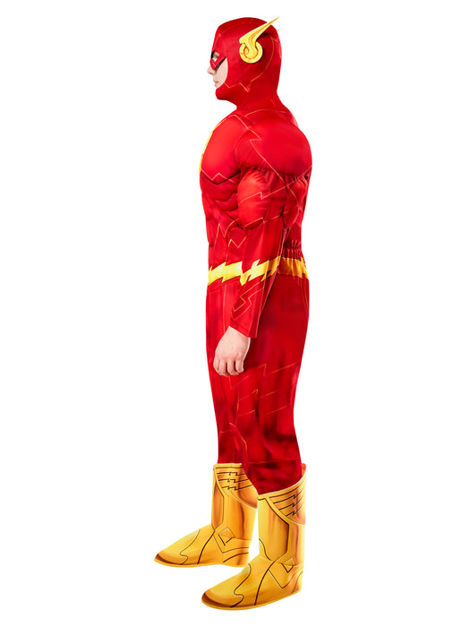 • You'll be beating all your friends in a foot race this year when you get all decked out in our Men's Big and Tall Flash Muscle Chest Costume. With this set, you will receive everything you need to become everybody's favorite superhero speedster. Featuring a vibrant red muscle padded jumpsuit with bright yellow shoe covers, as well as a matching red headpiece, you'll be taking down all kinds of villains and foes while all beefed up in this muscular attire. Pick up your costume today!
