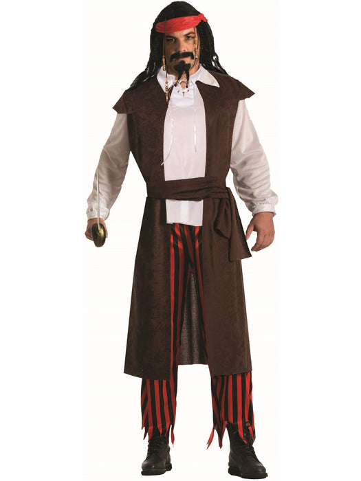 • Command the high seas in style with our Men's Buccaneer Baron Costume! This dashing costume includes a long brown vest with an attached shirt and a belt, perfect for channeling your inner pirate captain. Transform into the fearless leader you've always wanted to be and set sail in this stunning ensemble.