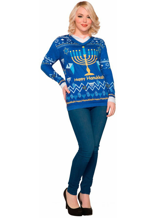 • Light up the menorah this year when you walk into the room with this awesome item from Costume SuperCenter. This item isn't like any other one that one would rock on Christmas. This one is not only stylish but it really shows your beliefs with every stitch. Our Men's Chanukah Sweater is definitely one that everyone is going to love, especially you.