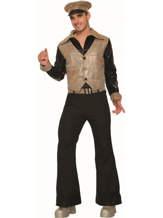 • Unleash your inner disco diva with our Men's Disco King Gold Costume! This stylish ensemble includes a sleek black and shimmering gold shirt with an attached vest and matching belt. Get ready to light up the dance floor and shine like a true star!