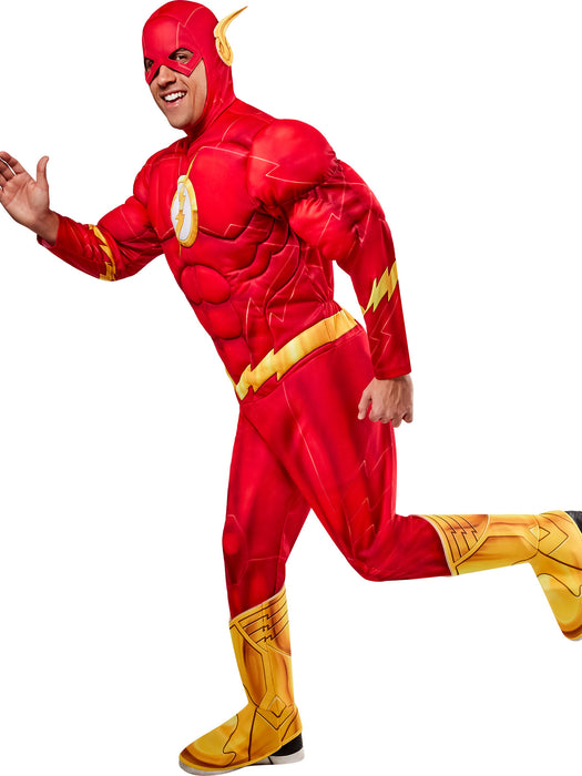 • If you're a huge fan of DC Comics legend the Flash, then you're going to have the speediest time of our life sporting our Men's Flash Muscle Chest Costume - Deluxe. With this set, you will receive everything you need to give all your foes a barrages of punches and kicks before they even have a chance to blink. Featuring a bright red jumpsuit with yellow accents, a pair of yellow shoe covers, and a matching Flash mask, you can do no wrong with this killer superhero wear.