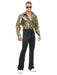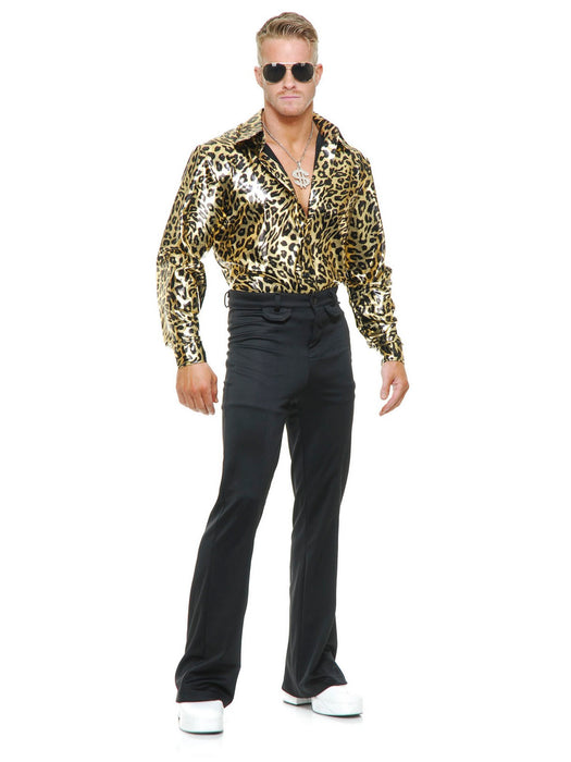 • Transform yourself into a literal blast from the past this Halloween with our Men's Gold Leopard Disco Shirt acting as your vehicle. The shiny gold material covered in leopard spots has surely traveled through time to get here. Why not pair it with some black slacks, your best dancing shoes, a big gaudy gold chain and pendant, and hit the Halloween bar hopping circuit? Before you know it you'll run into someone wearing leg warmers and a very eased hairstyle who perfectly matches with your vibe.