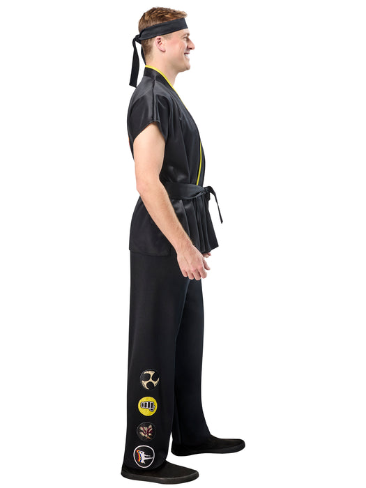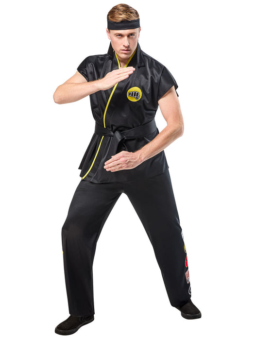 • Step into the dojo and embrace your Cobra Kai spirit with the officially licensed Men's Karate Kid Classic Cobra Kai Johnny Lawrence Costume! This costume is perfect for fans of the Karate Kid series and the hit show Cobra Kai, bringing to life the classic look of Johnny Lawrence, the iconic karate champion. Featuring a black and yellow top, black pants, black belt, and black headband, capturing all the details of Johnny's legendary style. Whether you're gearing up for Halloween, a themed party, or a cosplay event, this costume will make sure you stand out as the ultimate Cobra Kai sensei. Order now and get ready to show no mercy with the ultimate cobra kai look.
