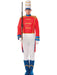 • You'll look like a classic Christmas decoration come to life while you're dressed up in this Men's Toy Soldier Costume. This themed ensemble is perfect not only for festivities that take place during the holiday season, but it also makes a great Halloween costume. Included in your purchase is a complete outfit consisting of a pair of white pants and a red tail coat featuring gold detailing around the waist, on the sleeves and on the stripes adorned both vertically and horizontally across your torso. The same metallic color is additionally found on the fringed shoulder pads, decorates the blue boot covers and is on the tall, white hat with a blue brim that completes your costume. Also available on our site is a matching Drum Major Drum with Sticks, as well as prop weapons to help accessorize your Christmas themed outfit.