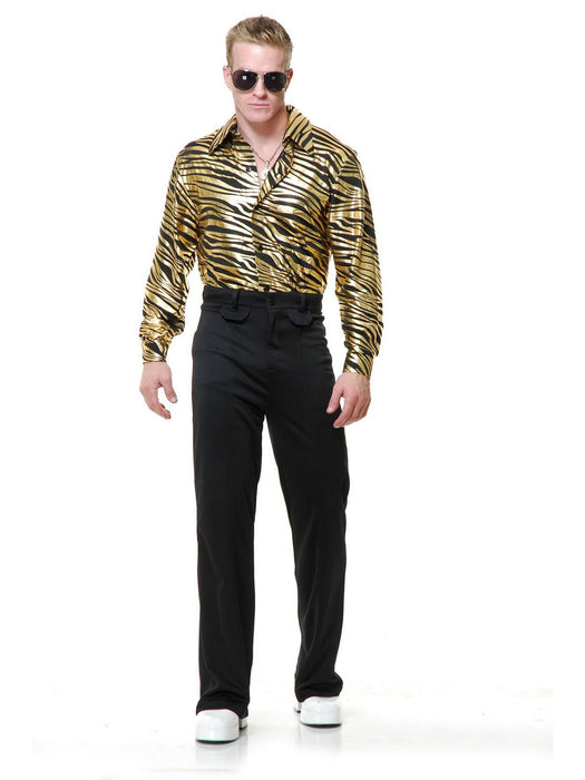 • Unleash your wild animal. Unleash your inner beast with this Men's Zebra Print Disco Shirt. It's exactly what it sounds like. A silky, zebra patterned, disco shirt that was made for the 70s, but would do well in today's themed party and Halloween scenes. Pair them with black bell bottoms and platforms to really sell the look you're going for. Order one and take it for a spin the next time an excuse to go disco comes up. You won't be disappointed.