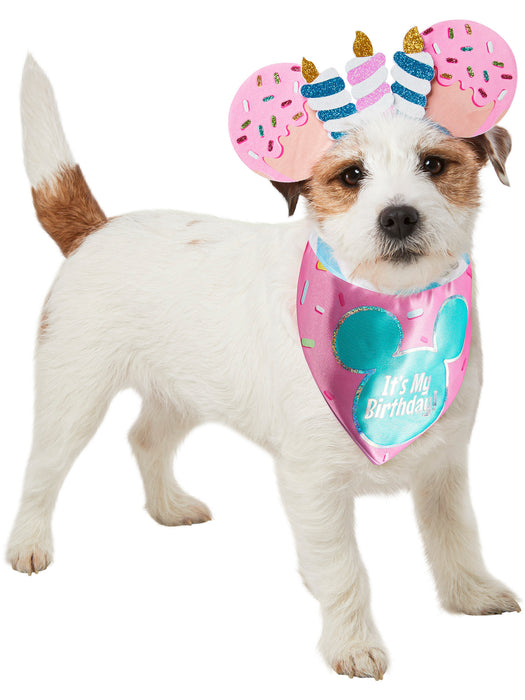 • If it's your pup's big day, then you definitely want to make them feel special with our Pet Mickey Mouse Birthday Accessory. With this set, you will receive everything your dog needs to celebrate their birthday in a grand way. Featuring a pink birthday cupcake ears headband with dazzling candle accents, as well as a matching bandana that says "It's My Birthday!" on the front, you're going to love seeing your furry friend wagging their tail wearing this one.