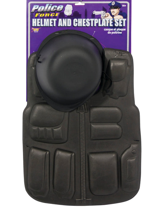 • They are going to call you in for back up when wearing the Police Helmet and Vest Set. As a tactical specialist your job is to confront the bad guys head to head. This kit includes a black plastic helmet. The chest plate is modeled to look like a vest and has molded pockets and pouches. Gearing up for a confrontation is part of the job and someones got to do it. Be bold and brave as an officer to protect others.