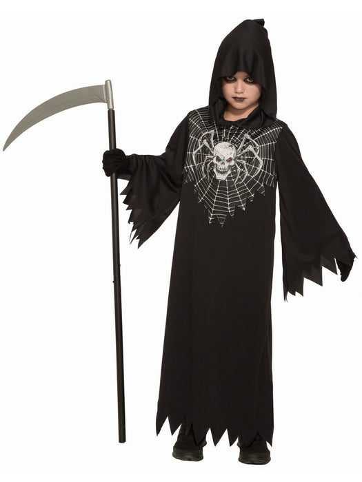 • This Promo Creepy Reaper Child Costume is one of the most classic Halloween icons in culture, so your child is sure to give his friends a scare when he shows up to class as the angel of death itself! This costume is easy for you too, since you can just put him in this hooded robe and have done with Halloween prep. This hooded robe has all the scare factor of the more elaborate Grim Reaper costumes, but with half the effort!