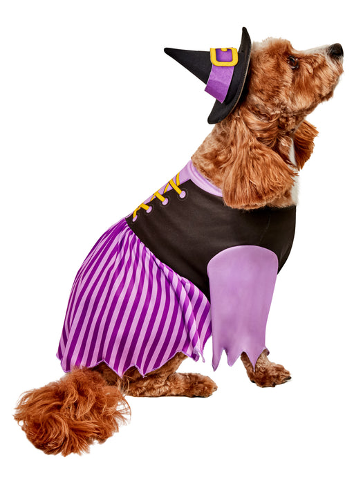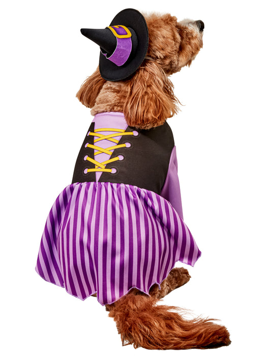 • Your pup will be casting all kinds of spells this year when they're wearing our Purple Witch Pet Costume. Whether your dog is manifesting new dog bones or brewing potions that will hypnotize you to buy them a new toy, they'll be looking too cute for words when they're sporting the look of a doggy sorceress. Featuring a pretty black and purple dress with stripes, along with a matching pointy black witch hat with a purple accent buckle design, you're going to fall in love with this precious wear on your pup.