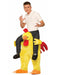 • Why did the chicken cross the road? Because the person on his back wanted to get to the other side. Step into the Ride a Chicken Adult Costume and you will look like you are riding a large yellow rooster. It is a big yellow bird with a red comb on top of its head, a large red tail feather, red wattle on its neck and a yellow beak. Now you can practice the chicken dance for the next wedding you attend.