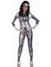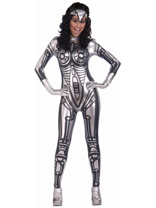 • Take sex appeal to the next level with a futuristic outfit that is on the cutting edge of attractive robotic lady products. The Robot Womens Costume will have you looking more machine than woman, but somehow we think youll still possess plenty of appeal regardless. This outfit features a form-fitting silver jumpsuit decorated with robotic plate lines as well as a headpiece making for a top-to-bottom cybernetic look that is a modern legend. Pick up a laser pistol and make-up kit for even extra fun.