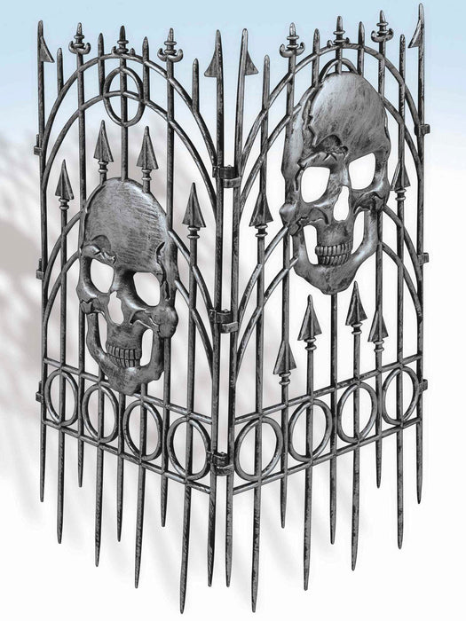 • Turn your front lawn into a haunted cemetery or decorate the inside of your home for the Halloween party with our Silver Skull Fence. With each order, you'll receive two pieces of prop fencing. The silver fence is detailed with a skull focal point in the center of the fence. This spooky fence has a gothic look to it and can help set the perfect atmosphere for a Halloween party. The fence prop decoration is also a great addition to Haunted Houses. The fence is just under 3 feet high at 33.5 inches and is 38 wide with both pieces of the fence put together. Decorating for Halloween is always a blast and this Silver Skull Fence is a great piece to add to your spooky set up this year.