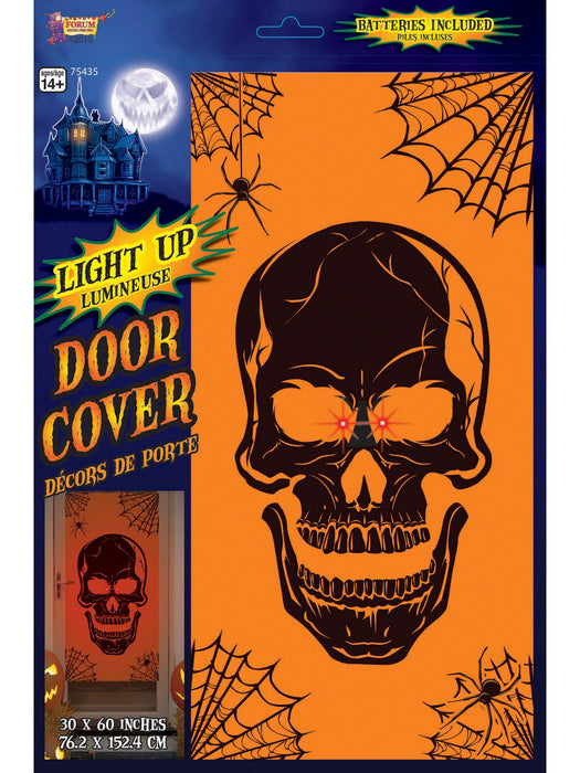 • Decorating your house for Halloween this year? Then don't forget to pick up our Skull Light Up Door Cover! With your purchase, you will receive a fun and spooky orange door cover featuring the print of a giant black skull as well as black spiderwebs and spiders in every corner. With its special light up design, you don't want to miss out on this one. Buy your skull door cover today, and then scan our site for the rest of your Halloween decorations and props!