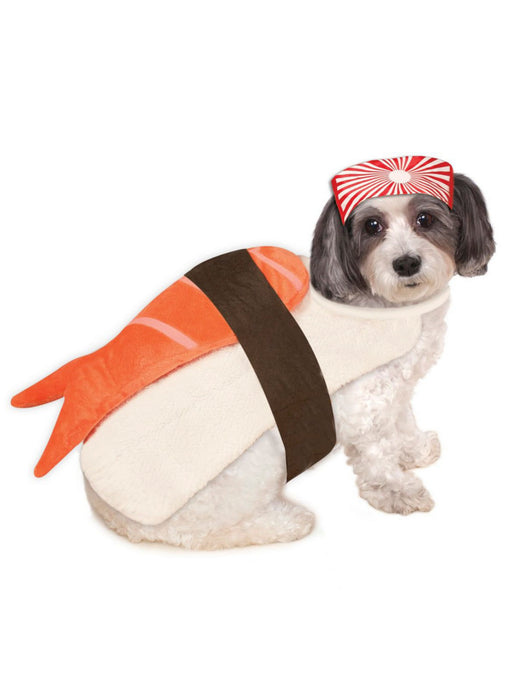 • Dress your dog up as your favorite food this Halloween in our Sushi Dog Pet Costume! Features a top that replicates rice with salmon on top and a red and white headpiece. Your best friend is going to look cute enough to eat when you have them suited up as this delectable looking sushi roll. You could joke that you got your dog from chef Jiro when youre bringing them around to trick-or-treat with your kids in this cute outfit. Your dog is also sure to be comfy in this costume, since its specially designed to keep a pup happy all night!