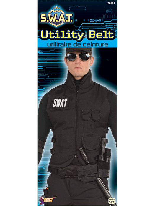 • Prepare for anything just by having this SWAT Team Utility Belt. You never know what can happen when youre an officer of the law. This item is perfect to keep yourself ready. You receive a black belt which has a couple of pouches attached. Use it to hold some of your police equipment. Pick it out to complete your own SWAT officer, GI Joe costume, and other ideas. There are toy weapons and other gear available on our website.